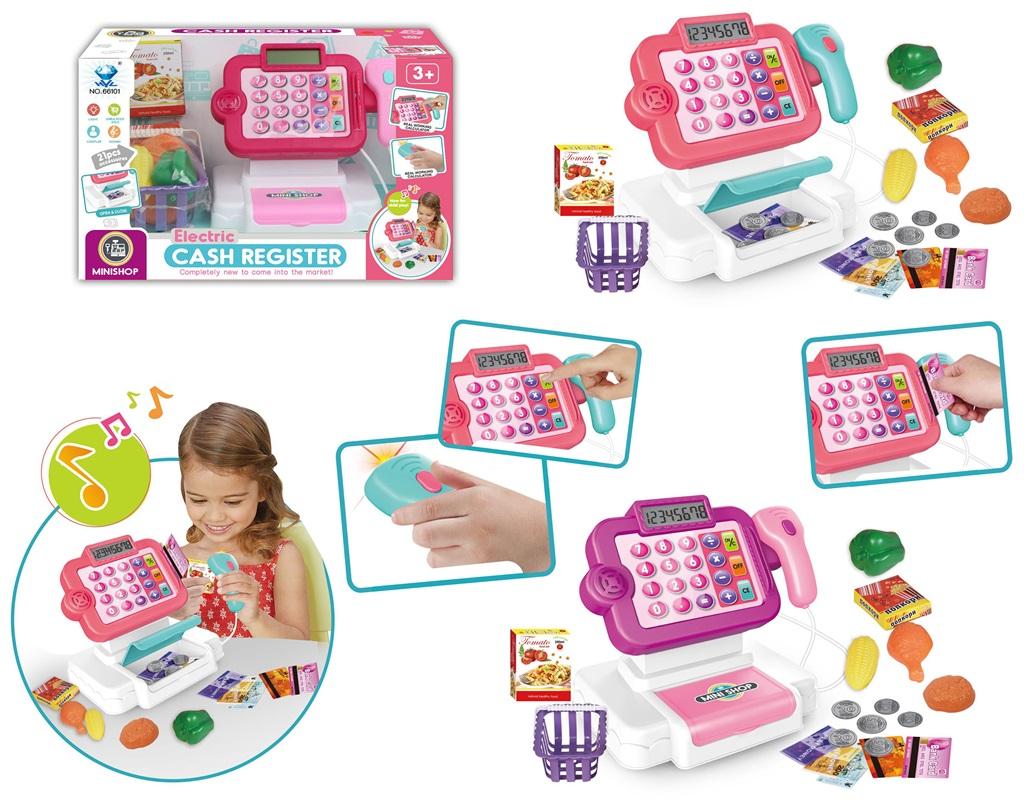 Kolorowa kasa sklepowa z czytnikiem kodów i szufladką na pieniążki. W zestawie mini koszyk zakupowy, artykuły spożywcze i pieniążki do zabawy. Kasa na baterie - działa na zasadach kalkulatora.