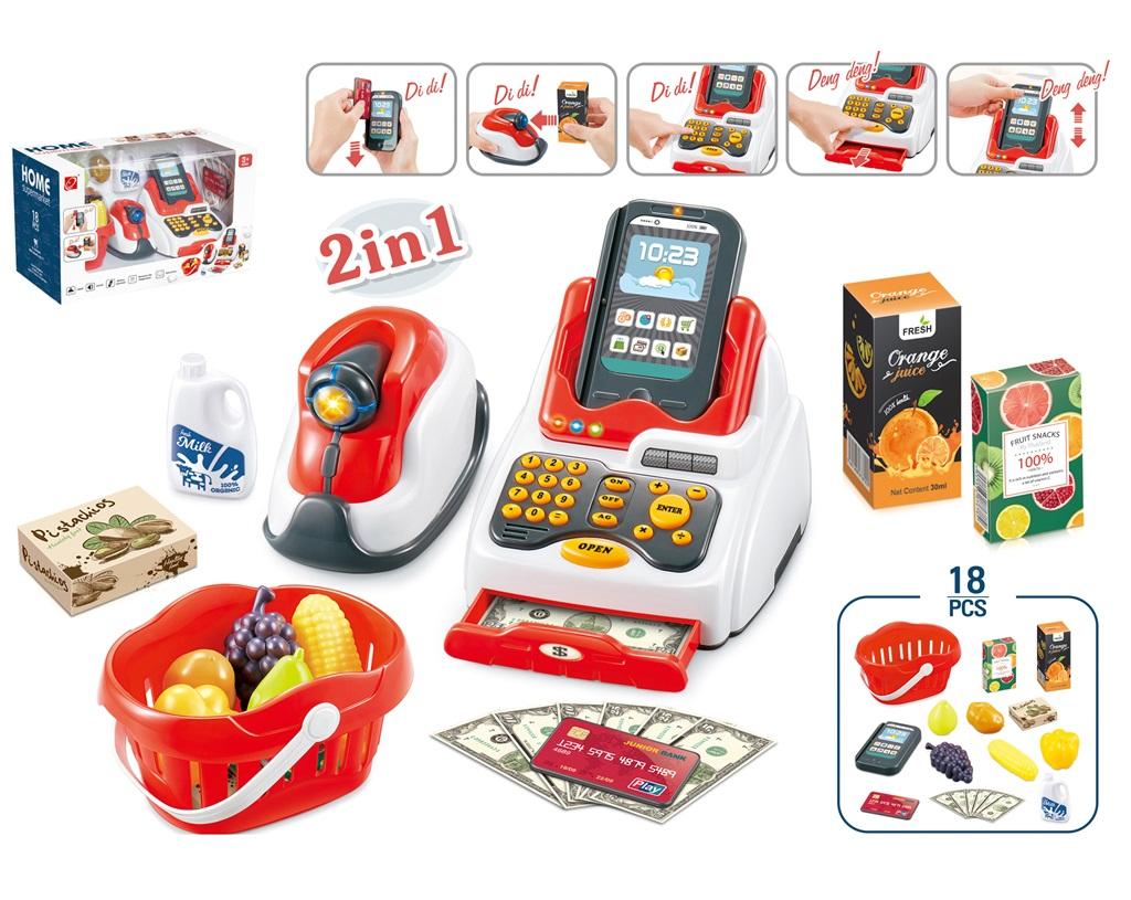 Kasa z czytnikiem i akcesoriami. W zestawie artykuły spożywcze, koszyk i pieniążki do obsługi kasy. Kasa i czytnik wydają dźwięki i świecą.