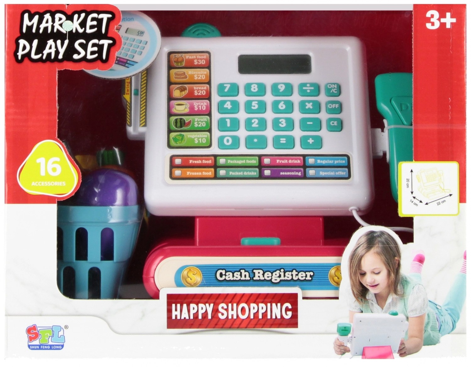 Zalety produktu: kasa sklepowa z akcesoriami, wyposażona jest we wszystko czego potrzebuje sprzedawca, dzięki czemu zabawa jest atrakcyjniejsza, kasa posiada efekty dźwiękowe, świetlne, czytnik skanerem produktów przy kasie wydającym efekt dźwiękowy odzwierciedlając prawdziwy, kasa z wyświetlaczem i czytnikiem kart oraz wysuwaną szufladą