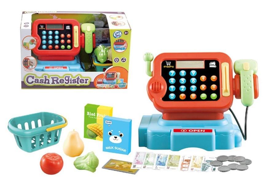 Interaktywna kasa sklepowa z akcesoriami. W zestawie koszyk, produkty spożywcze, banknoty i monety do zabawy. Kasa wydaje dźwięki i świeci kolorowym światełkiem. Zabawka działa na baterie typu AA. Baterie nie są załączone do zabawki. Całość zapakowana w kartonowe pudełko. Zabawka przeznaczona dla dzieci od lat 3.
