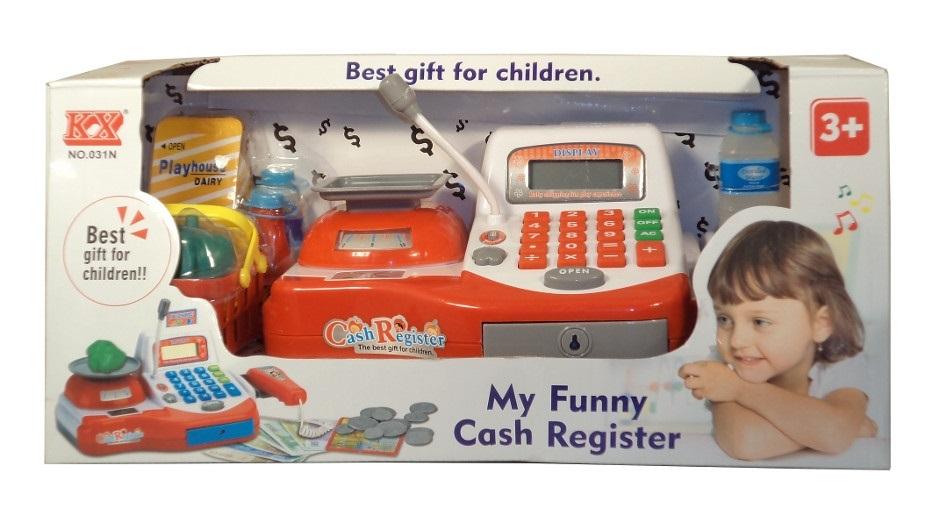 Plastikowa kasa sklepowa ze skanerem, koszyczkiem, wagą i z akcesoriami (m.in. zakupami, pieniędzmi). Kasa działa na baterie. Szuflada otwiera się na przycisk. Brak baterii w zestawie. Zabawka przeznaczona dla dzieci powyżej 3 roku życia.