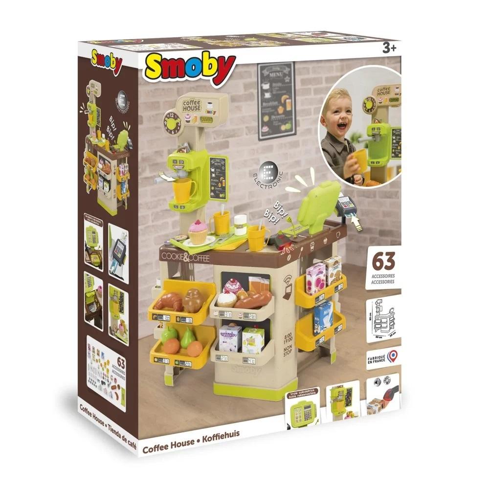 Duży zestaw sklepowy zawierający zintegrowany ekspres do kawy, kasę elektroniczną z funkcją kalkulatora i ekranem, skanerem z dźwiękiem i światłem, imitacją owoców i słodyczy, kubeczki, talerzyki, tackę, monety i banknoty, w sumie aż 63 akcesoria.