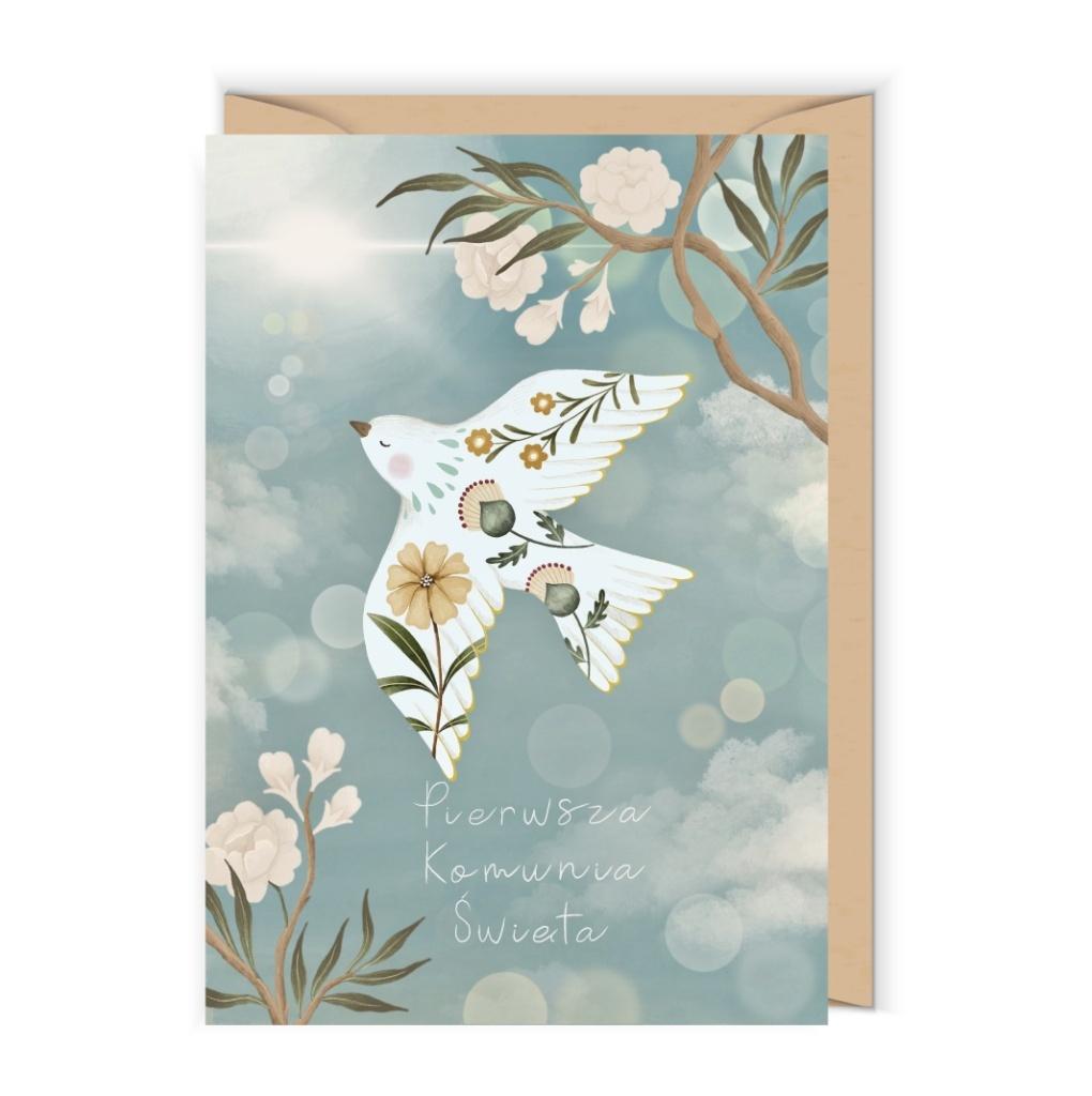 Otwierana kartka, pusta w środku, wykonana na papierze (z certyfikatem EFC) z wyraźnie widoczną fakturą. W zestawie ekologiczna koperta.