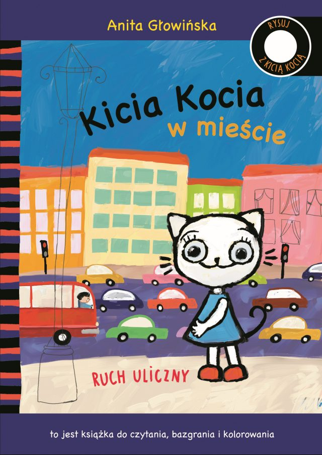 Kicia Kocia wybrała się na spacer po mieście. Jedzie tramwajem do centrum, gdzie jest mnóstwo ludzi i samochodów. Kicia Kocia uczy się poruszać w wielkim mieście, przechodzić przez jednię i uważać na ruch pojazdów. Podobnie jak w poprzednich kolorowankach, dużo tu miejsca do bazgrania i samodzielnego malowania.