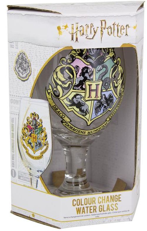 Wznieś toast dzięki temu pięknie zaprojektowanemu kieliszkowi zmieniającemu kolor z herbem Hogwartu. Herb z symbolami każdego z czterech domów szkolnych: Gryffindor, Hufflepuff, Ravenclaw i Slytherin; W herbie znajduje się również słynne motto szkoły – „Draco dormiens nunquam titillandus” (Nigdy nie łaskotaj śpiącego smoka).