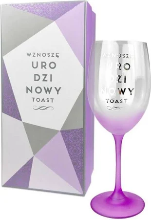 Elegancki urodzinowy kieliszek zapakowany w estetyczne , kolorowe pudełko.