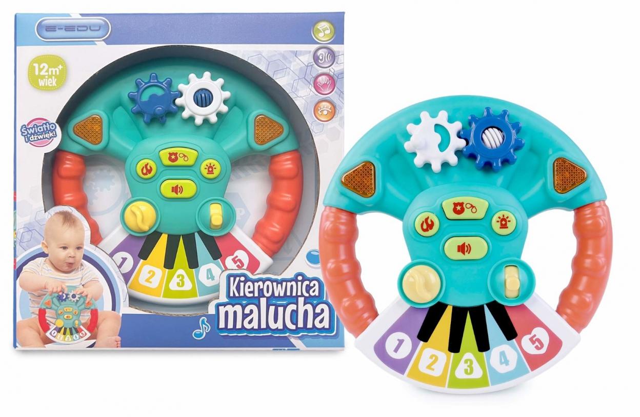 Funkcje: pianino z 2 trybami: dźwięki klawiszy lub piosenki, stacyjka po przekręceniu włącza odgłosy uruchamiania silnika, przełącznik: przód - dźwięk przyspieszania, tył - sygnał cofania, przyciski aktywujące: dźwięki klaksonu, sygnały dźwiękowe karetki pogotowia, radiowozu, wozu strażackiego, obracające się biegi, podświetlane kierunkowskazy, wym. zabawki: 18 x 18 x 3 cm, wym. opak. 21,5 x 23 x 4,5 cm, baterie: 2 x AAA 1,5 V (brak w zestawie), 12 m+