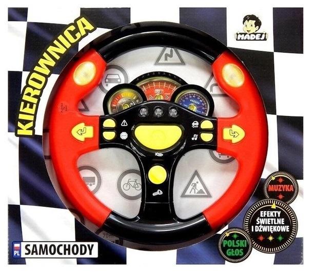 Kierownica wyposażona jest w 7 przycisków, które po naciśnięciu wydają komunikaty i dźwięki. Zabawka śpiewa i mówi po polsku. Opakowanie w polskiej wersji językowej