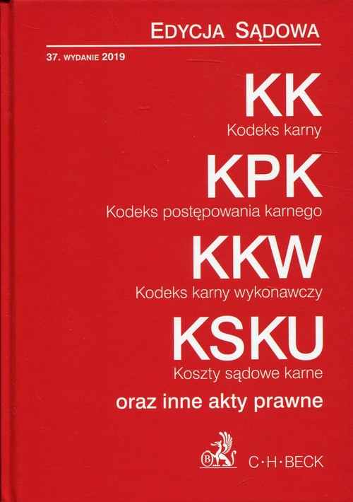 Stan prawny: 7 stycznia 2019 r. Zbiór zawiera następujące zmiany: Kodeks wykroczeń: 11.7.2019 r. – zmiany z ustawy o zmianie ustawy - Prawo o ruchu drogowym oraz niektórych innych ustaw z dnia 24 listopada 2017 r. (Dz.U. z 2018 r. poz. 79). Kodeks postępowania karnego – nowy tekst jednolity (Dz.U. z 2018 r. poz. 1987): 1.1.2019 r. – zmiany: z ustawy o zmianie ustawy o nieodpłatnej pomocy prawnej oraz edukacji prawnej oraz niektórych innych ustaw z dnia 15 czerwca 2018 r. (Dz.U. z 2018 r. poz. 1467); z ustawy o komornikach sądowych z dnia 22 marca 2018 r. (Dz.U. z 2018 r. poz. 771). 23.6.2018 r. – zmiany wynikające z wyroku Trybunału Konstytucyjnego z dnia 14 grudnia 2017 r. (Dz.U. z 2017 r. poz. 2405). Kodeks postępowania w sprawach o wykroczenia: 1.1.2019 r. – zmiany z ustawy o zmianie ustawy o nieodpłatnej pomocy prawnej oraz edukacji prawnej oraz niektórych innych ustaw z dnia 15 czerwca 2018 r. (Dz.U. z 2018 r. poz. 1467), 1.5.2019 r. – zmiany z ustawy o zmianie ustawy - Kodeks wykroczeń oraz niektórych innych ustaw z dnia 4 października 2018 r. (Dz.U. z 2018 r. poz. 2077), 23.6.2018 r. – zmiany wynikające z wyroku Trybunału Konstytucyjnego z dnia 14 grudnia 2017 r. (Dz.U. z 2017 r. poz. 2405). Kodeks karny skarbowy – nowy tekst jednolity (Dz.U. z 2018 r. poz. 1958): 1.1.2019 r. – zmiany: z ustawy o komornikach sądowych z dnia 22 marca 2018 r. (Dz.U. z 2018 r. poz. 771); z ustawy o Solidarnościowym Funduszu Wsparcia Osób Niepełnosprawnych z dnia 23 października 2018 r. (Dz.U. z 2018 r. poz. 2192); o zmianie ustawy o podatku dochodowym od osób fizycznych, ustawy o podatku dochodowym od osób prawnych, ustawy - Ordynacja podatkowa oraz niektórych innych ustaw z dnia 23 października 2018 r. (Dz.U. z 2018 r. poz. 2193), 2.1.2019 r. – zmiany z ustawy o zmianie ustawy o Krajowej Administracji Skarbowej oraz niektórych innych ustaw z dnia 9 listopada 2018 r. (Dz.U. z 2018 r. poz. 2354). Ustawa o przeciwdziałaniu narkomanii: 1.1.2019 r. – zmiany: z ustawy o zmianie ustawy o Krajowej Administracji Skarbowej oraz niektórych innych ustaw z dnia 9 listopada 2018 r. (Dz.U. z 2018 r. poz. 2354); z ustawy - Przepisy wprowadzające ustawę - Prawo o szkolnictwie wyższym i nauce z dnia 3 lipca 2018 r. (Dz.U. z 2018 r. poz. 1669). Zbiór ustaw: KK. KPK. KKW. KSKU. oraz inne akty prawne. Edycja Sądowa zawiera: Kodeks karny, Przepisy wprowadzające Kodeks karny, Kodeks wykroczeń, Kodeks postępowania karnego, Przepisy wprowadzające Kodeks postępowania karnego karny, Kodeks postępowania w sprawach o wykroczenia, Przepisy wprowadzające Kodeks postępowania w sprawach o wykroczenia, Ustawę o świadku koronnym, Kodeks karny wykonawczy, Kodeks karny skarbowy, Przepisy wprowadzające Kodeks karny skarbowy, Ustawę o opłatach w sprawach karnych, Ustawę o postępowaniu w sprawach nieletnich, Ustawę o przeciwdziałaniu narkomanii.