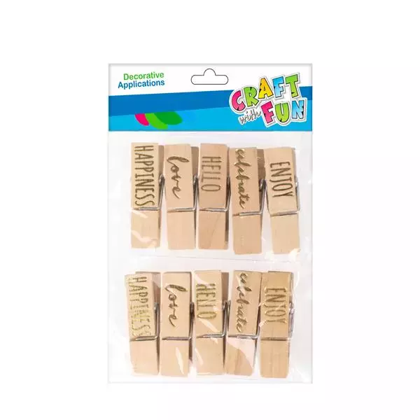 Zawartość opakowania: 10 szt. 4 cm spinaczy z napisami. Produkt wykonany z drewna.