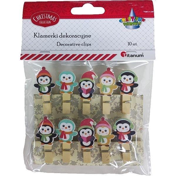 Klamerki drewniane z dekorem naturalne dekor pingwiny w czapkach 5 wzorów 10szt.