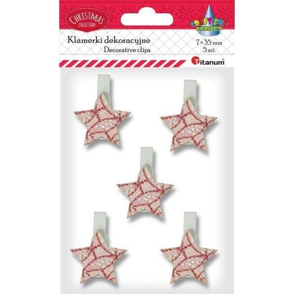 Klamerki drewniane z dekorem białe 7x35mm gwiazdki 32mm różowe z brokatem 5szt.