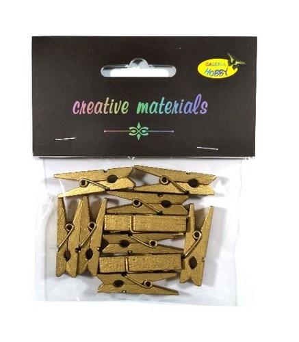 Małe kolorowe, drewniane klamerki ozdobne wielkości 35 mm pakowane w opakowanie z eurozawieszką. Opakowanie zawiera 10 sztuk klamerek w kolorze złotym.