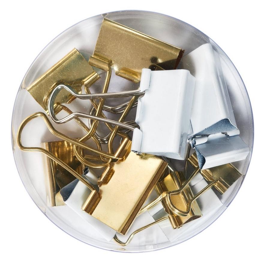 W okrągłum opakowaniu znajduje się 12 metalowych klipsów w trzech rozmiarach: 19mm, 25mm i 32mm. Występują w białym i złotym kolorze.