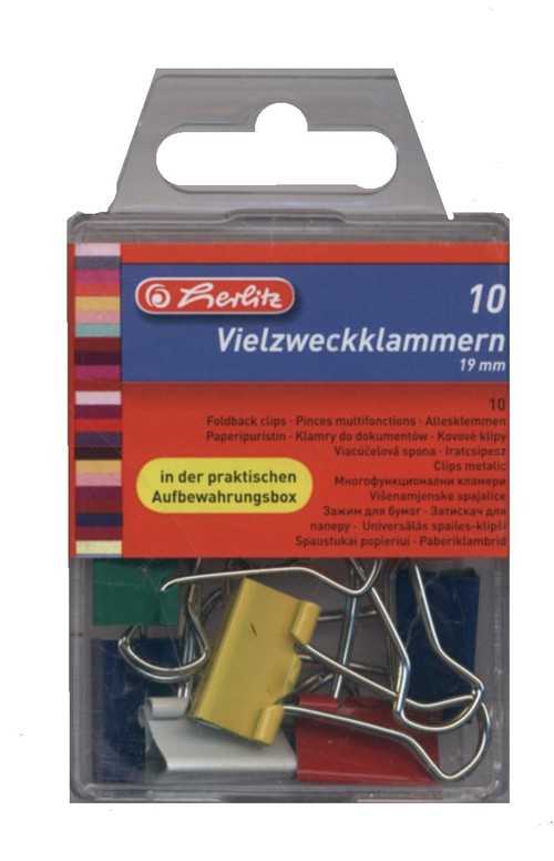 Klamry, uniwersalne zaciskowe spinacze do łączenia większej ilości dokumentów. Konstrukcja uchwytu zaciskowego umożliwia wpięcie pliku do segregatora. Grubość pliku do 19 mm. Metalowe, lakierowane, 10 szt. w opakowaniu. Różne kolory.