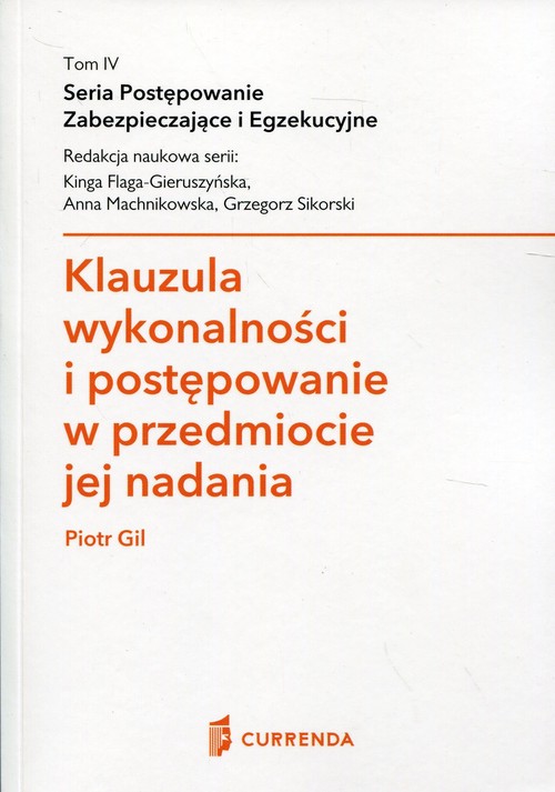 Postępowanie Zabezpieczające i Egzekucyjne to ponad dwadzieścia pozycji książkowych, razem kilka tysięcy stron poświęconych problemom egzekucji i zabezpieczenia. Poruszono w nich zagadnienia teoretyczne oraz wskazano problemy praktyczne związane z prowadzeniem egzekucji i dokonywaniem zabezpieczenia roszczeń w obecnym czasie. W poszczególnych publikacjach omówiono wszystkie rozdziały części II i III kodeksu postępowania cywilnego, zgodnie z jego systematyką. Wiedza odnosząca się np. do danego sposobu egzekucji zawarta jest w odrębnych publikacjach. Każda z publikacji w serii zawiera kompleksowe omówienie tytułowego zagadnienia. Postępowanie Zabezpieczające i Egzekucyjne tom czwarty poświęcony został postępowaniu klauzulowemu. Autor „Postępowania w przedmiocie nadania klauzuli wykonalności” dr Piotr Gil ma już w swoim dorobku prace poświęcone temu zagadnieniu. Stąd też nieprzypadkowo zdecydowano się właśnie jemu powierzyć opracowanie tej części serii. - Redaktor Naukowy dr Grzegorz Sikorski Poszczególne zagadnienia omawiane w opracowaniu zostały przedstawione szeroko, na wysokim poziomie merytorycznym. [...] Autorowi udało się umiejętnie połączyć dobry poziom merytoryczny warstwy naukowej pracy z wysokim stopniem przydatności praktycznej, uzyskanym dzięki widocznej swobodzie, z jaką porusza się w omawianych zagadnieniach. Z recenzji dr. hab. Andrzeja Jarochy