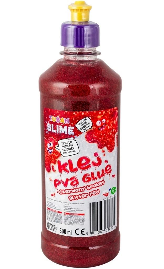Nasz brokatowy klej PVA to niezbędnik każdego kreatywnego twórcy. Idealnie nadaje się do klejenia papieru i tektury. Stanowi także znakomitą bazę do tworzenia plastycznych Slimów, a najlepsze efekty uzyskasz łącząc go z aktywatorem marki Tuban (w proporcjach 100 ml kleju na 50 ml aktywatora). W gęstej, intensywnie fioletowej masie kleju znajdują się tysiące brokatowych drobinek, dzięki którym każdy glutek będzie mienił się niesamowitym blaskiem. Nasz klej produkowany jest w Polsce. Jak się bawić? 1. Wlej brokatowy klej PVA do miseczki/pojemnika. 2. Powoli dolewaj aktywator. Mieszaj Slime tak długo, aż masa zacznie oddzielać się od ścianek pojemnika. 3. Wyrabiaj Slime do uzyskania przez niego idealnej konsystencji. Jeśli nadal będzie zbyt mocno kleił się do rąk, dodaj do niego jeszcze odrobinę aktywatora. 4. Twój brokatowy Slime jest już gotowy! . 5. Pamiętaj, że Slime na dłużej zachowa swoje właściwości i nie będzie wysychać, jeśli po skończonej zabawie schowasz go do zamykanego pudełka.
