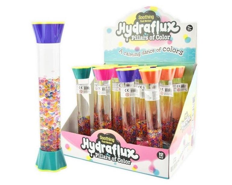 lepsydra wykonana jest z przeźroczystego, gładkiego w dotyku tworzywa. W środku znajduje się płyn o konsystencji żelu. Po obróceniu zauważamy powolne przelewanie się i mieszanie cieczy i mnóstwa kolorowych kulek w bardzo powolnym tempie. Kulki swobodnie wirują, spadają, odbijają się i kołyszą. Obserwacja pozwala nam uspokoić wzrok, wyciszyć myśli. Dobrze wpływa na koncetrację wzrokową.