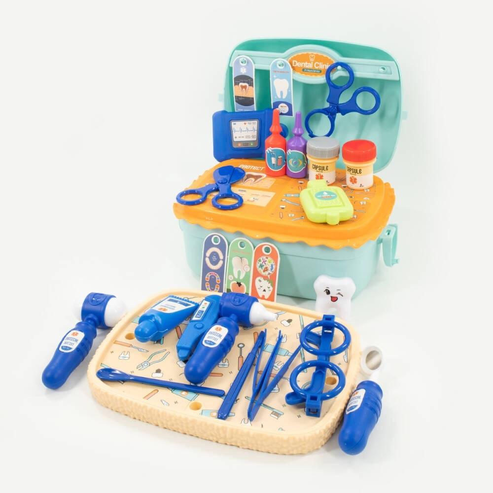 W zestawie znajdziemy nożyczki, młotek, krople, maść, pęsetę, szczypczyki, skalpel. Produkt nie wymaga użycia baterii. Przenośna klinika dentystyczna przeznaczona jest dla dzieci powyżej 3 roku życia.