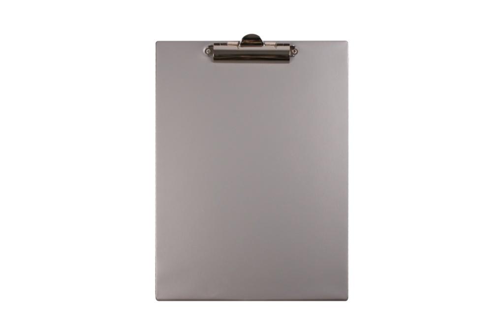 folia PVC kolorowa, środek usztywniony tekturą, sprężysty mechanizm zaciskowy służący do utrzymania kartek papieru, format A3, A4, A5 i A6; na zamówienie deska z klipem na dłuższym boku, występuje w 10 kolorach.