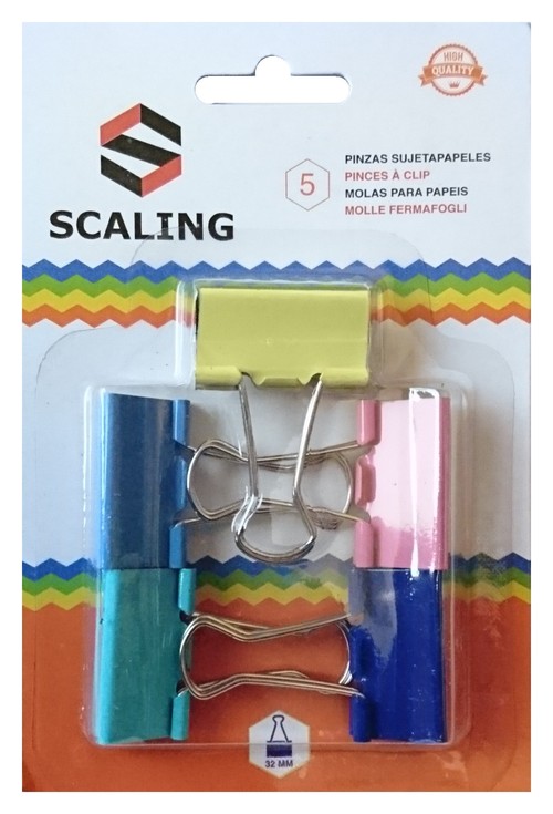 Klipsy metalowe na blistrze rozmiar 32 mm, 5 sztuk w różnych kolorach. Opakowanie zbiorcze zawiera 12 blisrów.