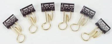 6 sztuk biurowych klipsów do papieru w kształcie złotych nut ósemek, o rozmiarach 19 x 40 mm. Doskonale nadają się do spinania nut - idealny, drobny prezent dla każdego melomana.