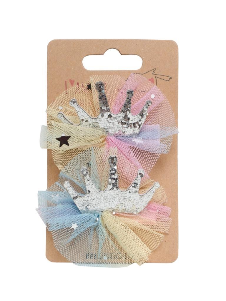 Zestaw klipsów ze srebrną koroną z tiulem.
