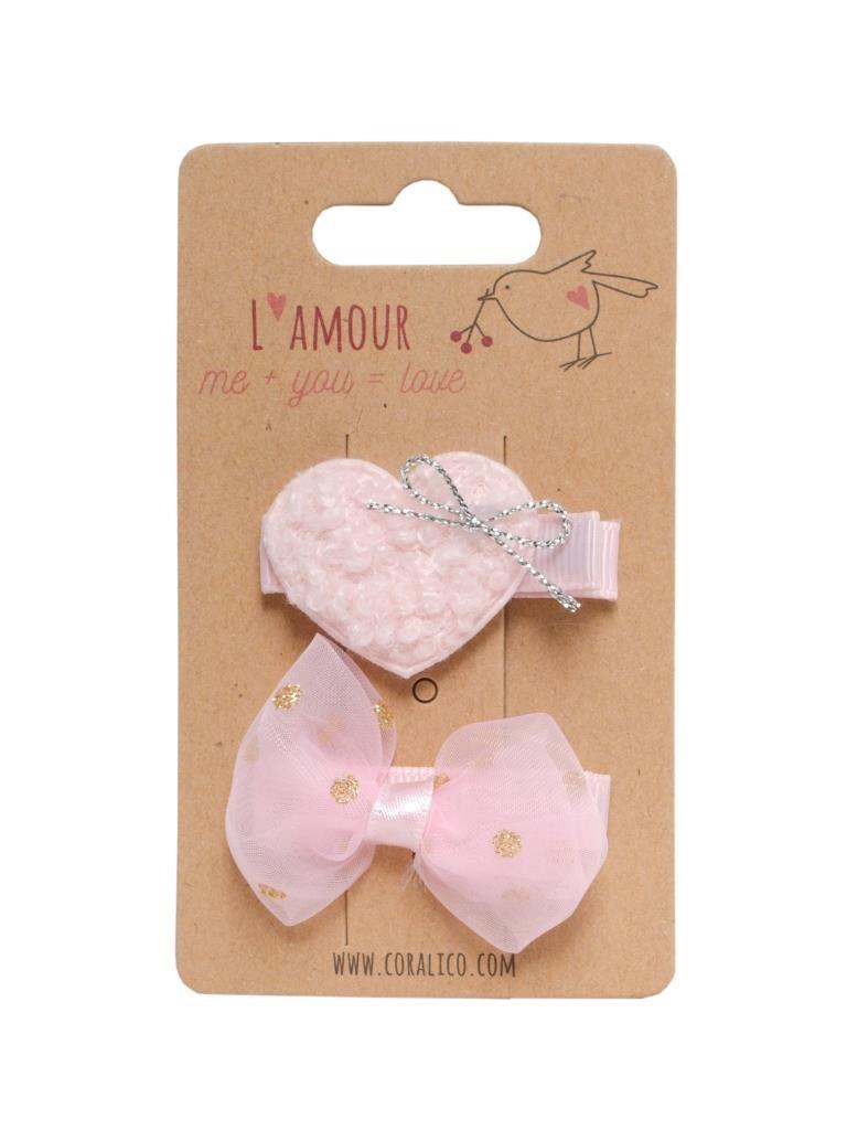 Zestaw klipsów z serduszkiem i kokardką w kolorze różu.