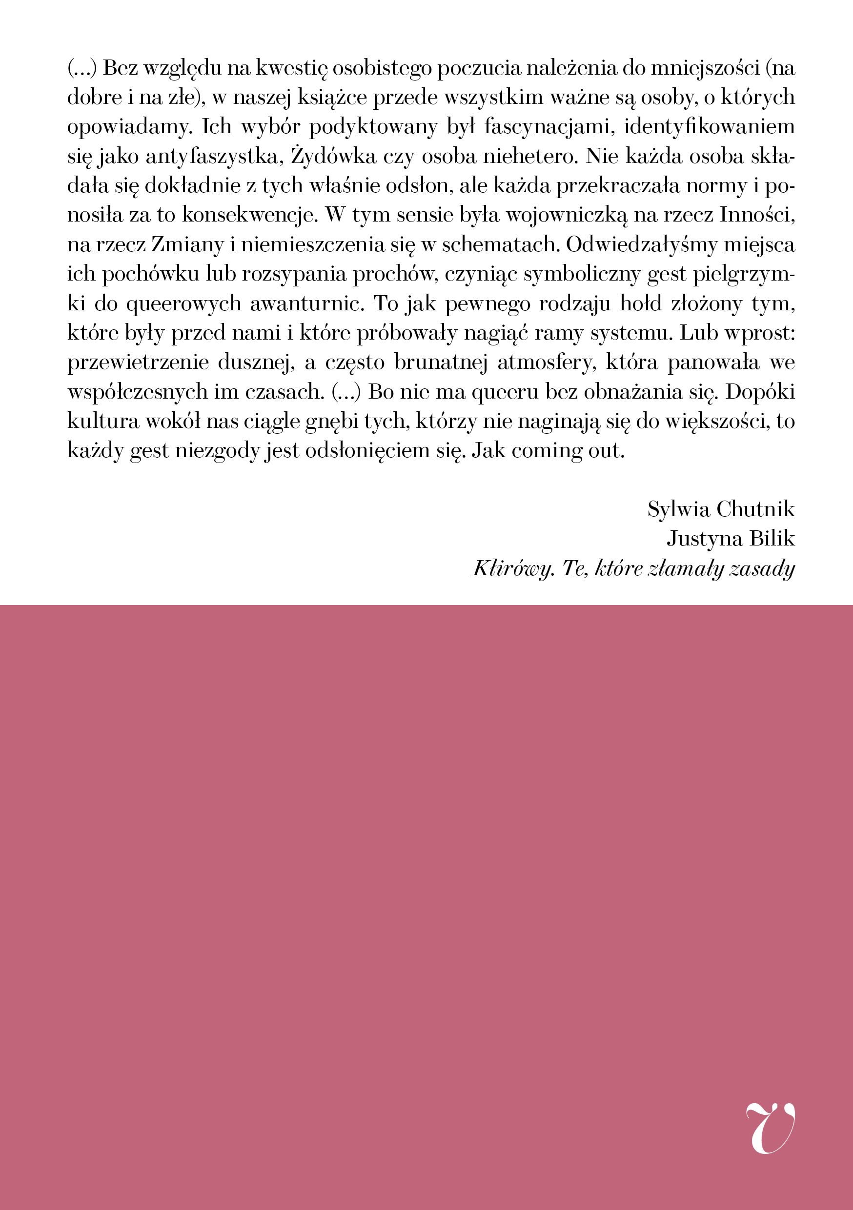 W książce Kłirówy Te które złamały zasady znajdziesz fascynujące biografie piętnastu niezwykłych kobiet, które stały się symbolem walki o akceptację i różnorodność. Każda z nich, w swoim unikalnym stylu, przyczyniła się do zmiany postrzegania osób queer, łamiąc utarte schematy i normy społeczne. To nie tylko opowieści o ich życiu, ale także o ich niezłomnej determinacji i odwadze w dążeniu do prawdy.