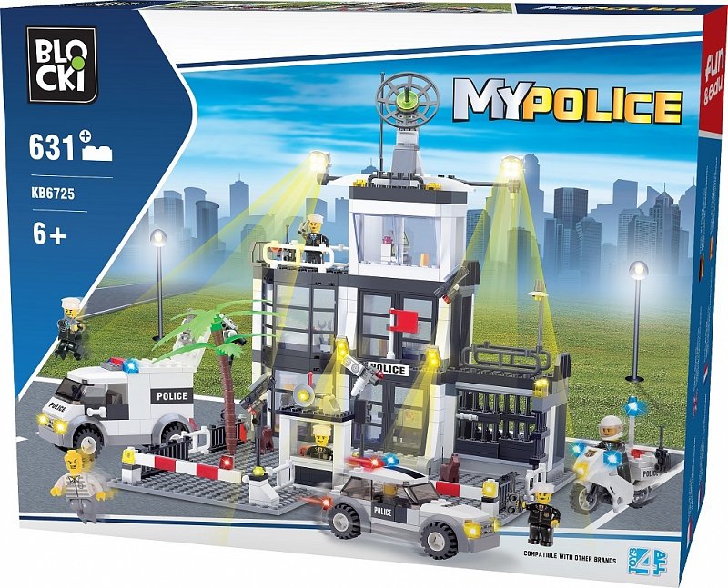 Zestaw klocków umożliwiający zbudowanie komendy głównej Policji z samochodem patrolowym, motocyklem i więźniarką. Zabawka dla dzieci w wieku od 6 lat.