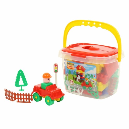 Klocki Budowniczy - zestaw 52 elementów Zapakowane w plastikowe wiaderko, z rączką ułatwiającą przenoszenie. Zabawka dla dzieci w wieku 3+