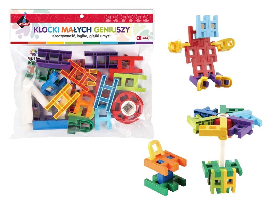 Klocki w kształcie drabinek. Zestaw posiada 23 kolorowe elementy które mogą być łączone w różne kształty. Uczą kreatywnego myślenia i doskonale rozwijają wyobraźnie.