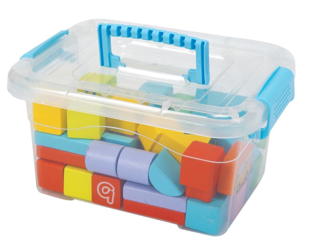 Zestaw 76 sztuk kolorowych klocków zapakowanych w plastikowy pojemnik z rączką. Dzięki różnorodnym kształtom z klocków można zbudować niezliczona ilość konstrukcji. Do zestawu dołączona została instrukcja z wzorami.