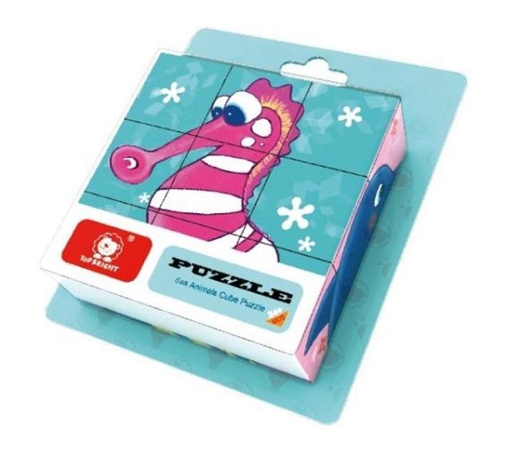 9 drewnianyck klocków do zbudowania 6 obrazków z morskimi zwierzętami.