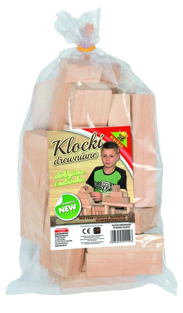 Zestaw składa się z 22 drewnianych klocków o różnych wielkościach i kształtach, które zostały wykonane z ekologicznego drewna. Całość zapakowana jest w worek foliowy.