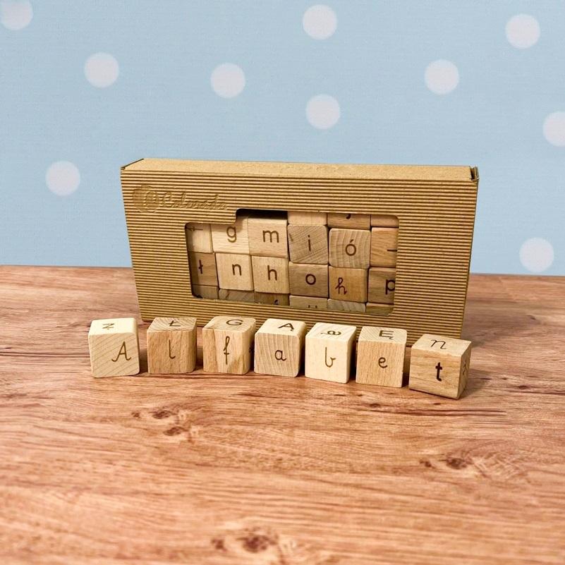 Prezentujemy klocki z alfabetem. Mają formę 32 kostek o wymiarach 25 x 25 x 25mm. Na klockach umieszczono alfabet pisany z małymi i dużymi literami oraz alfabet drukowany z małymi i dużymi literami.