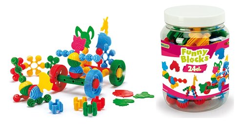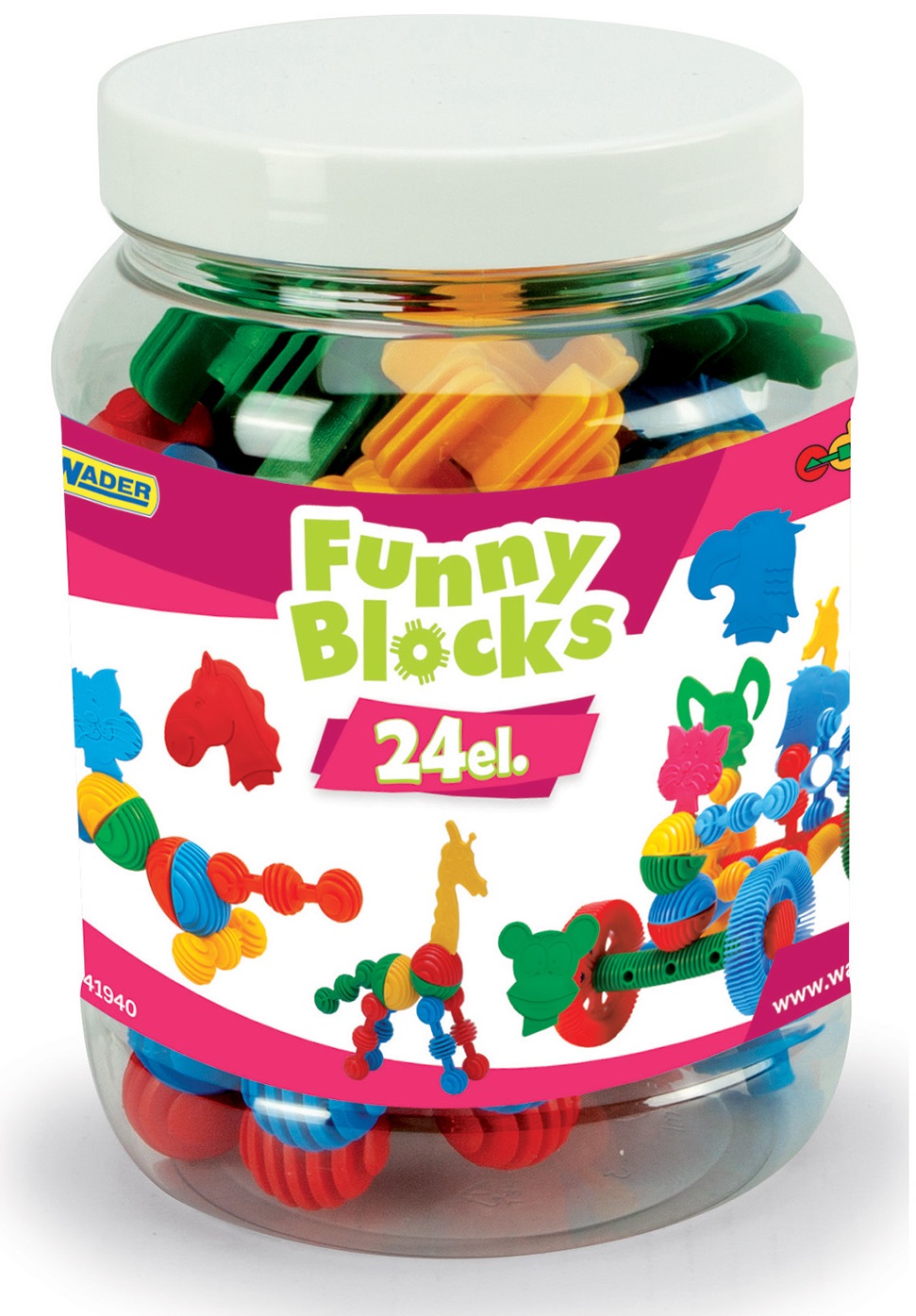 Klocki Funny to zestaw składający się z 24 elementów. Wśród nich znajdują się części w kształcie główek zwierząt, które w połączeniu z innymi klockami idealnie układają się w postać wybranego zwierzątka. Łatwy i precyzyjny system montażu, różnorodne kształty klocków Funny stwarzają wiele innych możliwości tworzenia konstrukcji, co pobudza wyobraźnię i kreatywność dziecka. W trakcie zabawy doskonali się koordynacja wzrokowo-ruchowa i precyzja wykonywanych ruchów naszych milusińskich, rozwija wyobraźnia przestrzenna i logiczne myślenie. Dziecko ćwiczy wytrwałość, koncentrację i umiejętność pokonywania przeszkód. Zabawa klockami funny wspomaga naukę kolorów, rozpoznawania kształtów, kształtowanie pojęć mały ? duży oraz zachęca do zabaw tematycznych z rówieśnikami czy rodzicami. Dzięki temu dziecko rozwija swoje umiejętności komunikacyjne, uczy się współdziałania, negocjacji i dzielenia się z innymi. Zabawka wykonana z wysokiej jakości, bezpiecznego i nietoksycznego tworzywa. Zestaw zapakowany jest w wygodne pudełko, które ułatwi przechowywanie klocków. zestaw 72 kolorowych kloców o różnorodnych kształtach wśród klocków m.in. takie o kształcie główek zwierząt system montażu ułatwiający precyzyjne łączenie poszczególnych elementów możliwość budowania konstrukcji przestrzennych praktyczne przechowywanie w słoiku (17 cm wysokości) klocki wykonane z bardzo trwałych, nietoksycznych, bezpiecznych materiałów zabawa klockami funny pobudza wyobraźnię, kreatywność i twórcze myślenie dziecka, doskonali koordynację wzrokowo-ruchową i precyzję wykonywanych ruchów, ćwiczy koncentrację, wytrwałość i umiejętność pokonywania przeszkód, wspiera umiejętności komunikacyjne oraz rozwój społeczny ? uczy współdziałania, negocjacji i dzielenia się z innymi oraz pomaga w nauce m.in. rozpoznawania kolorów i kształtów oraz w kształtowaniu pojęć mały ? duży czy relacji przestrzennych ? nad, pod, przed, obok zestaw doskonały do zabawy w pojedynkę oraz w grupie przeznaczone dla dzieci 3+