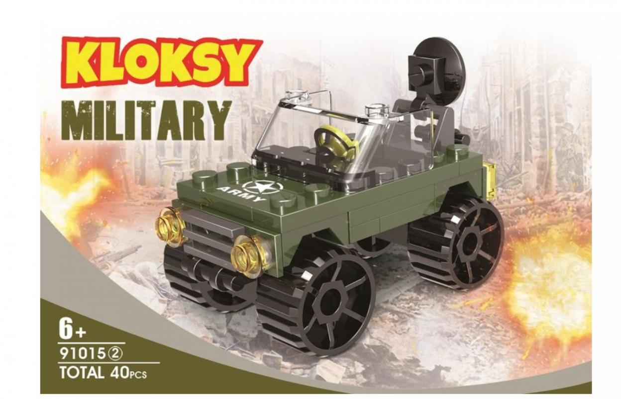 Klocki KLOKSY Seria armia - samochód wojskowy, 50 elementów. Zestaw pakowany w display 12 szt. wraz z innymi rodzajami pojazdów wojskowych.