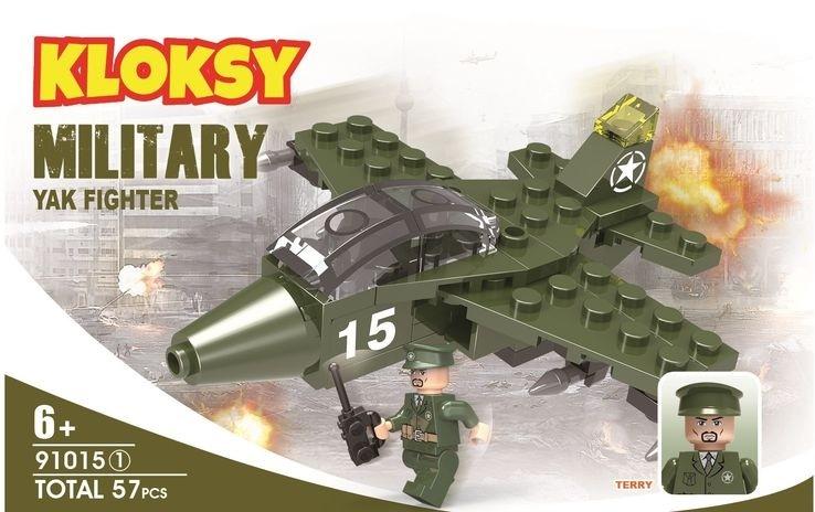 Klocki KLOKSY - Seria armia - samolot, 57 elementów. Zestaw pakowany w display 12 szt. wraz z innymi rodzajami pojazdów wojskowych.