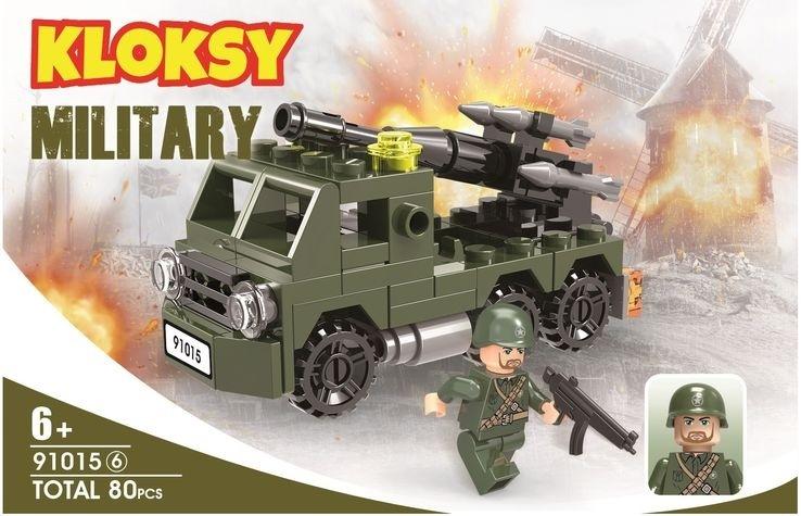 Klocki KLOKSY - Seria armia - wyrzutnia rakiet, 80 elementów. Zestaw pakowany w display 12 szt. wraz z innymi rodzajami pojazdów wojskowych.