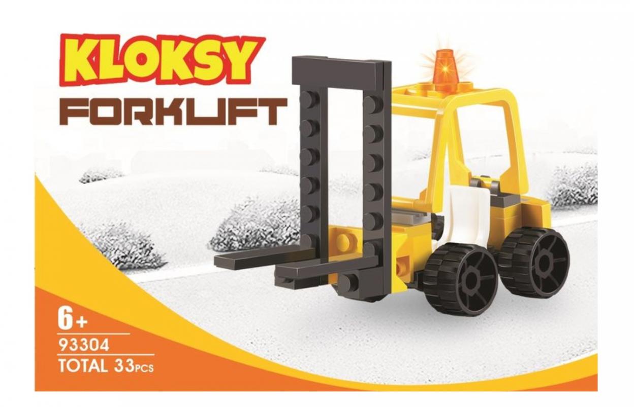 Klocki KLOKSY - Maszyny budowlane - wózek widłowy, 43 elementy. Zestaw pakowany w display 12 szt. wraz z innymi rodzajami maszyn budowlanych (6 rodzajów po dwie sztuki).