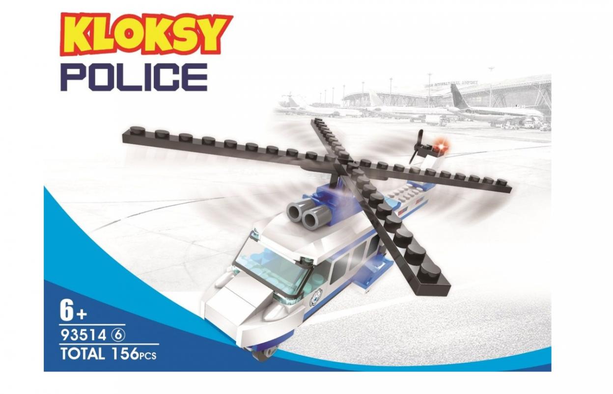 Klocki KLOKSY - seria policja - helikopter, 166 elementów. Zestaw pakowany w display 6 szt. wraz z innymi rodzajami pojazdów policyjnych.