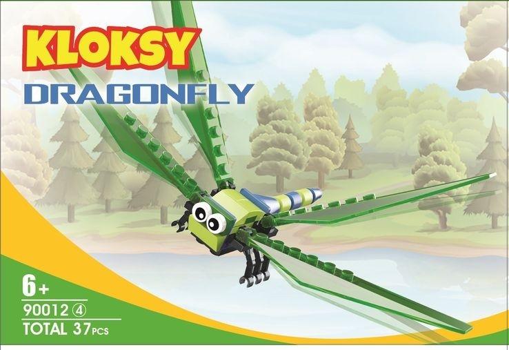 Klocki KLOKSY - Seria zwierzęta - ważka, 37 elementów. Zestaw pakowany w display 12 szt. wraz z innymi rodzajami zwierząt (6 rodzajów po dwie sztuki).