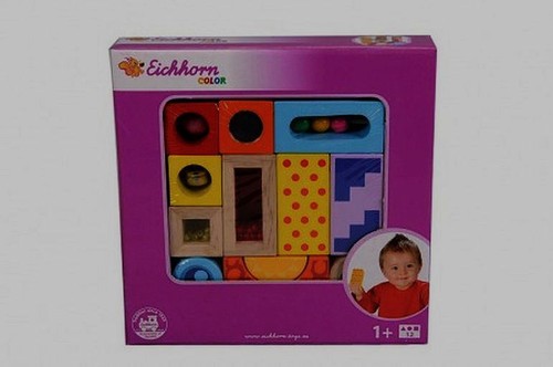 Kolorowe, drewniane klocki o różnych kształtach, z dźwiękiem.