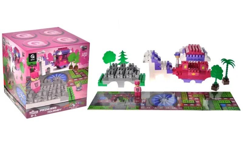 Seria "Blocs&Steps" od QBEE to coś więcej niż tylko klocki. W każdym zestawie, oprócz elementów konstrukcyjnych, znajdziesz tematyczną grę planszową typu "wyścig" oraz grę "memory".n"Podróż Księżniczek" to wielofunkcyjny zestaw, z którym wyruszysz w bajkową podróż wraz z księżniczkami: pokonuj przeszkody, otwieraj bramy zamków i pomagaj w odnajdywaniu zagubionych królewskich skarbów. Tematyczna gra planszowa dodaje dynamiki zabawie klockami, a wesoła gra "memory" rozwija uważność i pamięć. To idealny wybór dla rozwoju wyobraźni, logiki, motoryki małej oraz ducha współpracy. Trzy gry w jednym zestawie - trzy razy więcej radości!nWiek: od 3 latnZawartość zestawu: 139 elementów, 1 komplet puzzli, 1 kostka, instrukcja.nWymiary opakowania: 21 x 21 x 21 cm