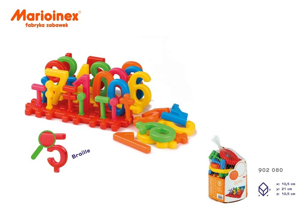 Zestaw klocków konstrukcyjnych 'świat cyfr w siatce' składający się z 21 elementów: 10x cyfry, 5x znaki działań, 6x klocki.