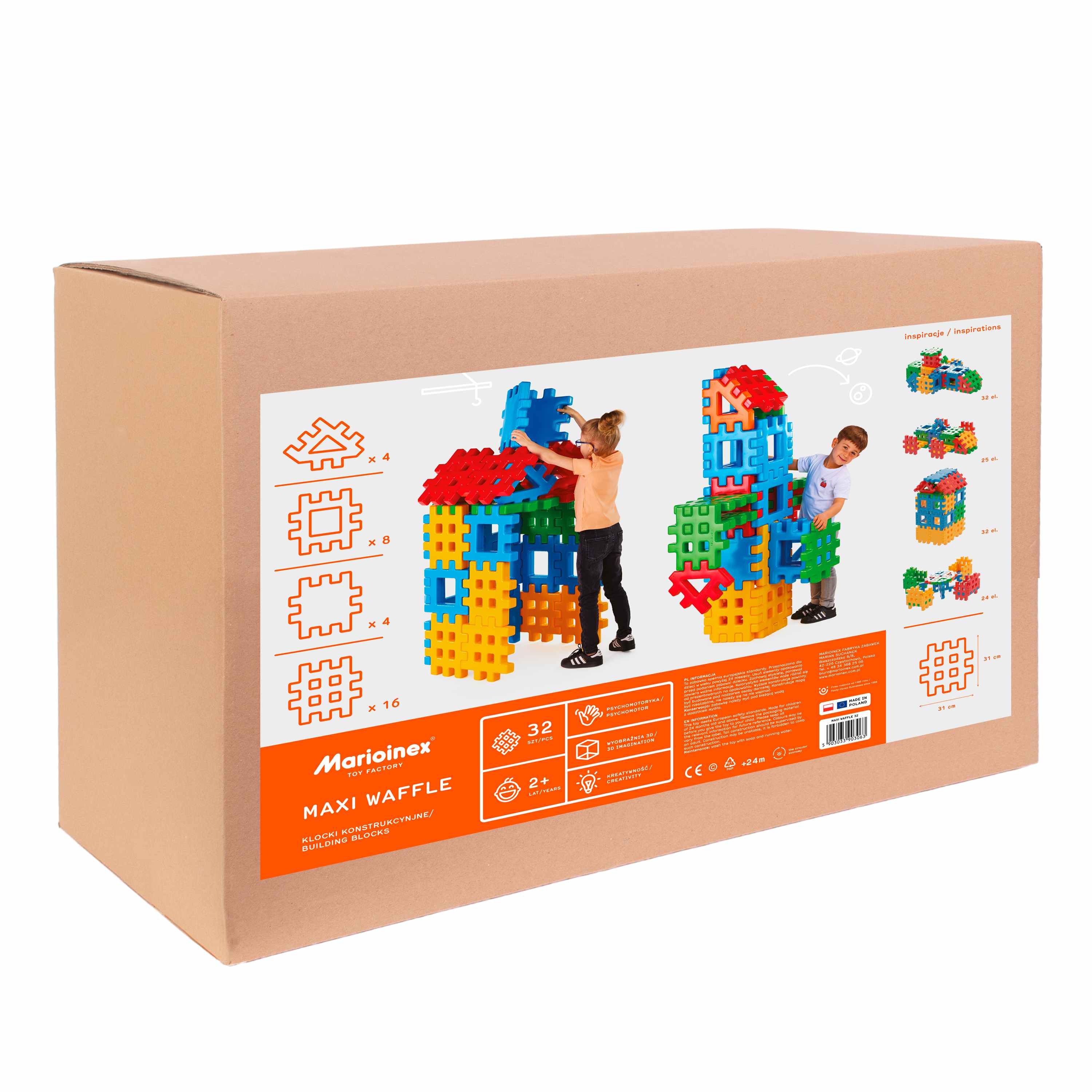 Seria MAXI to największa odmiana klocków Marioinex Waffle o wymiarach aż 31,531,5 cm i grubości 4,5 cm. Dzięki specjalnie zaprojektowanej formie łączą się ze sobą na różne sposoby dając nieograniczone możliwości konstrukcyjne.