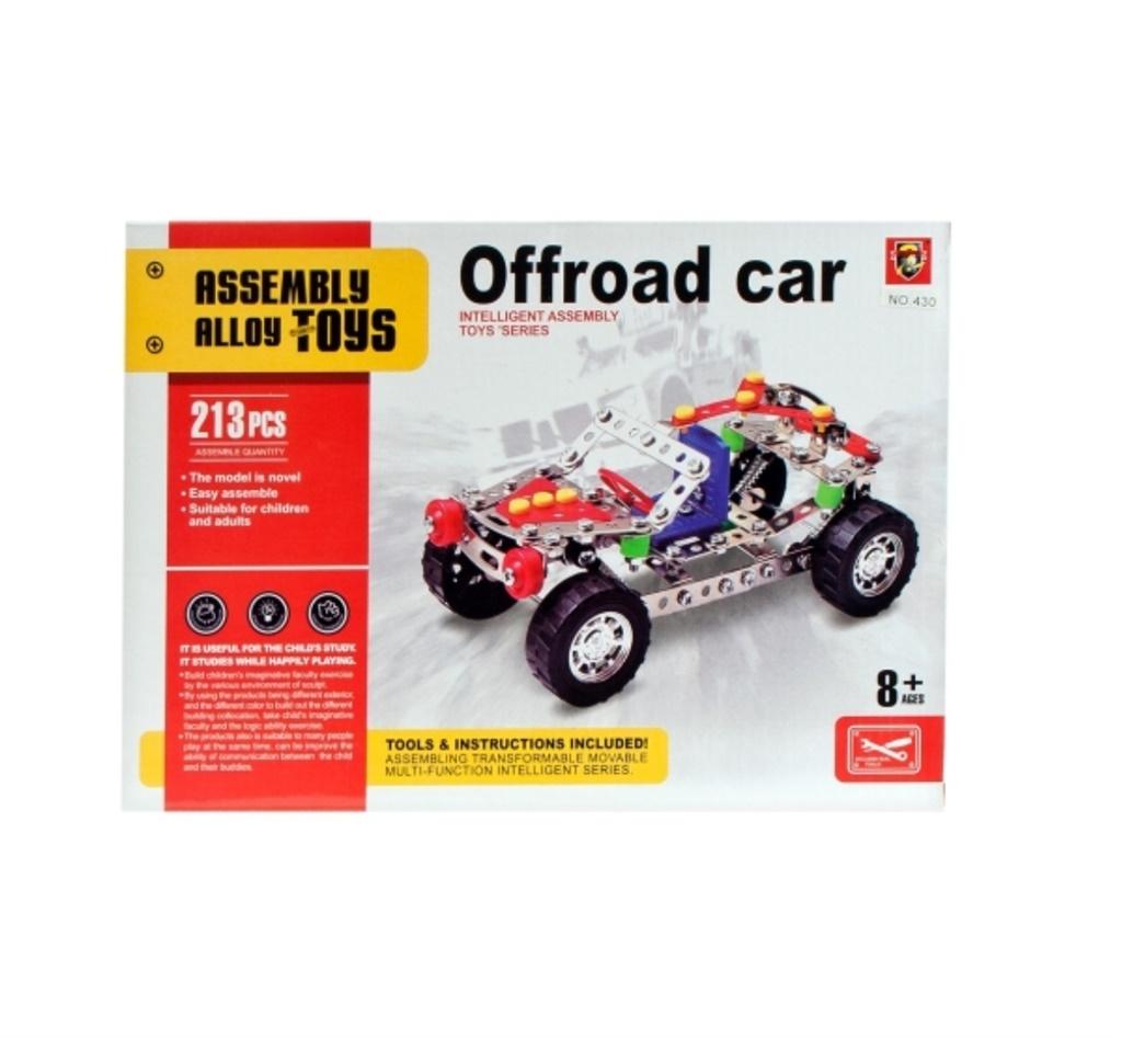 Zestaw metalowych klocków kontstrukcyjnych, pozwalających na złożenie samochodu. Narzędzia oraz instrukcja dołączona do opakowania.