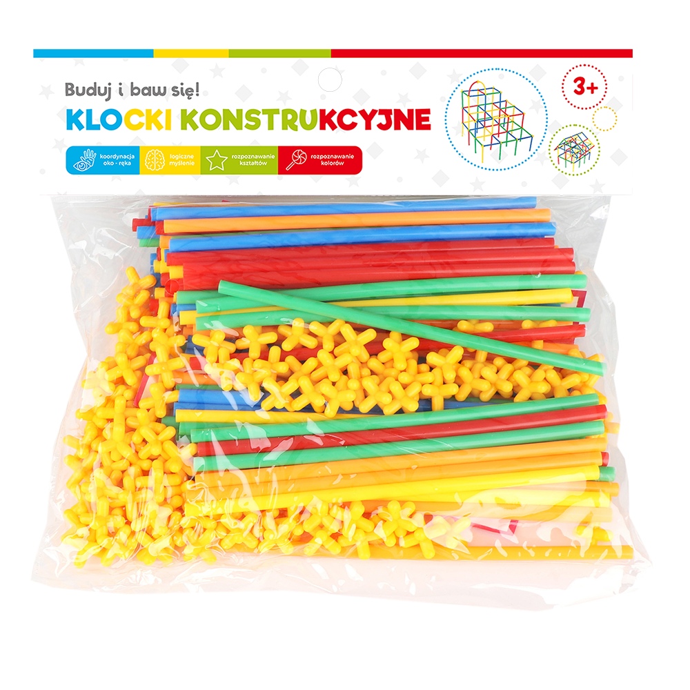 Klocki konstrukcyjne - słomki 220 elem. Klocki - słomki, które za pomocą krzyżaków, można łączyć w różne figury. 220 elementów w różnych kolorach. Patyk-słomka o wymiarach 19x0.5 cm