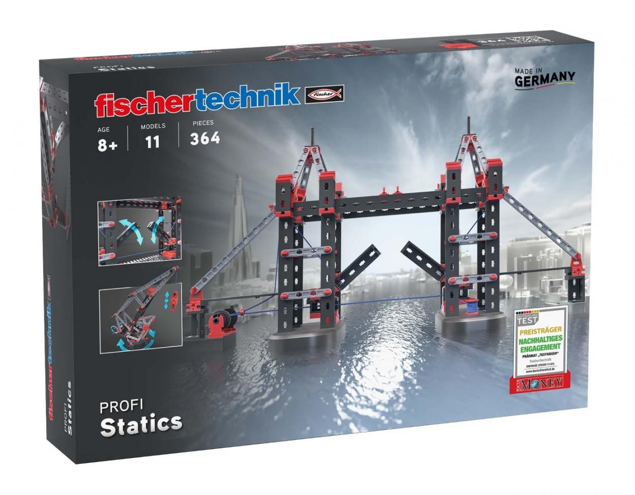 Zestaw to łącznie jedenaście imponujących modeli. Od modeli demonstrujących poszczególne zagadnienia, po konstrukcje typu mosty, wieże i dźwig. Zestaw fischertechnik Statyka zawiera wszystko, czego młodzi odkrywcy potrzebują, aby dowiedzieć się więcej o świecie statyki. Z zawartych w nim elementów zbudujesz słynne konstrukcje, takie jak wieża Eiffla i Tower Bridge. Obszerne materiały dodatkowe dostępne online, wyjaśniają i pogłębiają wiedzę zdobytą podczas zabawy.